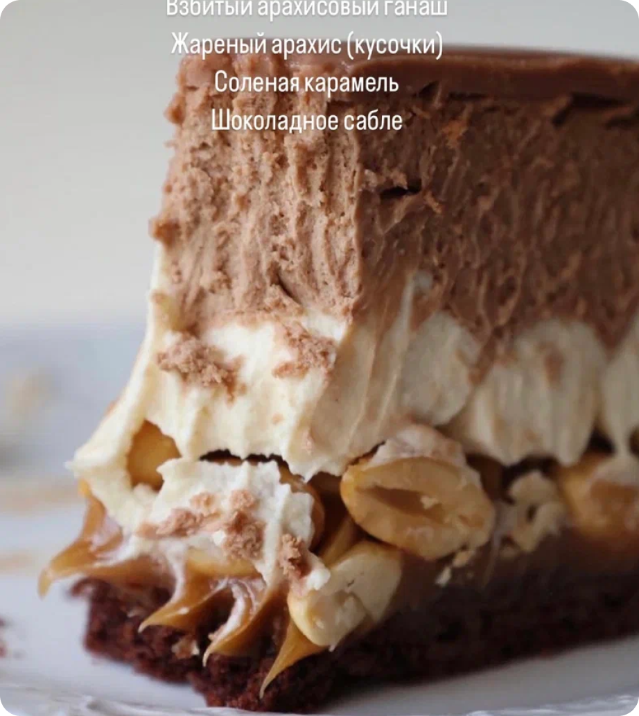 Сливки коровьи, молочный шоколад, белый шоколад, молоко коровье, яйцо куриное, масло сливочное, сахар, желатин, мука пшеничная, какао-порошок, арахисовая паста, арахис жареный, разрыхлитель, соль